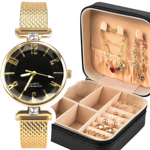 Relogio Feminino Banhado Aço + Brincos + Porta Joia + Colar Qualidade Premium Presente Este conjunto inclui um relógio analógico feminino dourado à prova d'água, um porta joias/relogio exclusivo, um colar em aço inoxidável banhado a ouro com pedrinha de strass, uma pulseira em aço inoxidável banhada com pingente, 5 pares de brincos em aço inoxidável banhados a ouro com diferentes formas, e um anel em aço inoxidável banhado a ouro.