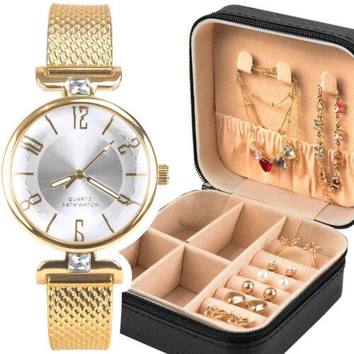 Relogio Feminino Banhado Aço + Pulseira + Colar Casual Qualidade Premium Presente Social Kit Elegante de Acessórios Banhados a Ouro