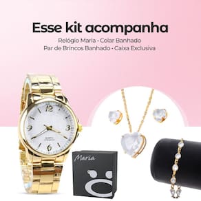 "Surpreenda-se com este elegante e deslumbrante kit de acessórios! Com um relógio analógico feminino dourado banhado a 18k, à prova d'água e feito em aço inoxidável, você terá estilo e durabilidade no seu dia a dia. O colar com pingente em strass transparente irá adicionar um toque de elegância e brilho sutil ao seu visual, enquanto o par de brincos e a pulseira, ambos banhados com strass transparentes, oferecem sofisticação e glamour para qualquer ocasião. E para agregar ainda mais valor, incluímos uma caixa Orizom Maria Premium! Perfeito para presentear a si mesmo ou aquela pessoa especial, este kit é uma combinação memorável de elegância e brilho. Não perca esta oportunidade de adquirir este presente incrível!"