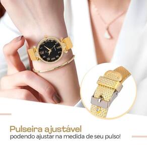 - Relógio Feminino Orizom Maria: Relógio analógico de ponteiro que une elegância e funcionalidade. Maquinário fabricado em aço inoxidável banhado a ouro, garantindo durabilidade e refinamento. Pulseira ajustável em silicone para conforto e versatilidade. Mostrador preto oferece um contraste moderno e sofisticado. Edição hiper limitada ideal para quem valoriza estilo e autenticidade.