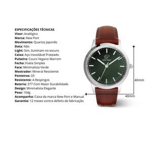 Medidas: - Diâmetro: 40mm- Espessura da Caixa: 07mm- Comprimento da Alça: 24cm- Largura da Alça: 20mm ESPECIFICAÇÕES TÉCNICAS - Visor: Analógico - Marca: New Port - Movimento: Quartzo Japonês - Data: Não - Light: Sim, iluminam no escuro - Caixa: Aço Inoxidável Prateado - Pulseira: Couro Vegano Marrom - Fecho: Fivela Simples - Face: Minimalista Verde - Mostrador: Mineral Resistente - Ponteiros: 03 - Resistente: A Respingos - Bateria: 377 Com Maior Durabilidade - Design: Minimalista Elegante - Peso: 104g - Categoria: Relógio Feminino - Acompanha: Caixa da marca New Port e Manual- Garantia: 12 meses contra defeito de fabricação Após a confirmação de compra, o código de rastreio será enviado em até um dia útil em seu e-mail. Marca: Não Informado