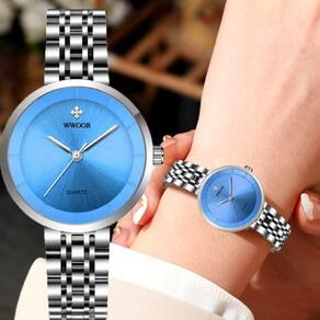 Relógio Feminino De Quartzo Minimalista Pulseira De Aço Inoxidável A Prova D´agua Azul Prata