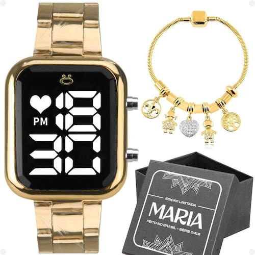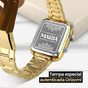 - Relógio Feminino Orizom Maria - Tipo: Digital - Formato: Quadrado - Cor: Banhado Dourado - Material: Aço inoxidável - Tampa: Blindada com arte exclusiva Maria e detalhes de autenticidade - Garantia de qualidade e estilo