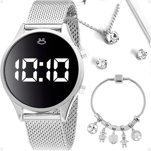 Surpreenda a Maria da sua vida com o elegante Kit Feminino Orizom Maria! Este conjunto inclui um Relógio Digital Orizom Maria, um colar em aço inoxidável, um pingente de strass e um par de brincos com design correspondente, além de uma pulseira em estilo com vários pingentes.