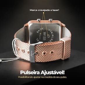Com seu design quadrado e visor LED bem visível, este relógio oferece uma experiência contemporânea incomparável. Seu charmoso tom rose e pulseira ajustável de silicone garantem conforto e um toque de delicadeza, tornando-o adequado para eventos formais ou encontros casuais.