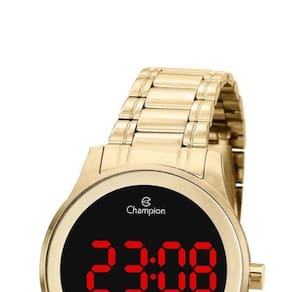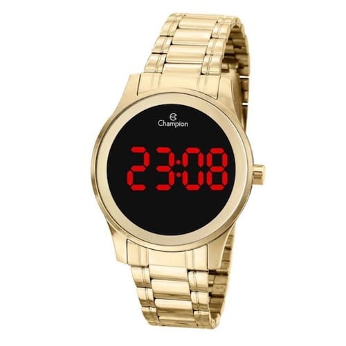 Características Composição do Vidro: Cristal Mineral Material da Caixa: Metal Cor da Caixa: Dourado Material da Pulseira: Aço Inox Cor da Pulseira: Dourado Mostrador: Digital Negativo, Led Vermelho