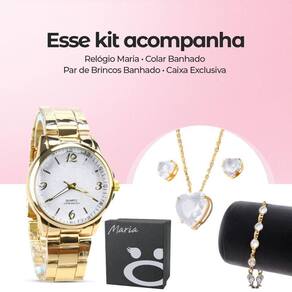Relogio Feminino Dourado + Colar Aço Strass + Caixa Pulseira Qualidade Premim Social Casual Presente Arrase no estilo com este kit incrível! Relógio analógico feminino banhado a 18k, à prova d'água e feito em aço inoxidável para durabilidade e elegância no dia a dia. Combine com o colar banhado em strass transparente para um toque de brilho sutil e sofisticado, e complemente com o par de brincos banhados com pedrinhas de strass para qualquer ocasião. E para finalizar, a pulseira banhada com vários strass transparentes adiciona um glamour irresistível ao conjunto. E ainda vem com uma caixa Orizom Maria Premium para garantir que seu presente seja ainda mais especial. Não perca essa oportunidade de presentear com estilo e sofisticação!