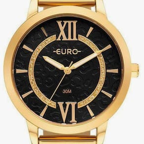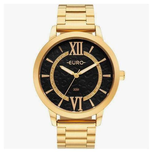 Relógio Euro Feminino EU2036YQYA/4D. É um relógio com 40mm de largura. Possui resistência à água de 3atm. Sua caixa é confeccionada em metal e sua pulseira em aço dourado, vidro de cristal mineral e mostrador texturizado preto. O funcionamento desse modelo é analógico simples.