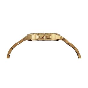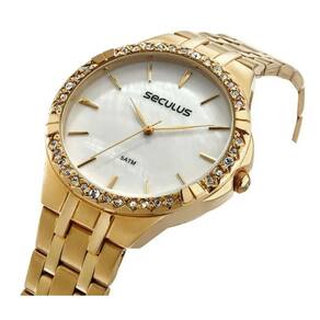 Relógio analógico com folheação dourada, com caixa de metal com cristais aplicados, e mostrador em madrepérola. Sua pulseira é aço super resistente com fecho de acionamento lateral de fácil ajuste, ideal para todos os pulsos, inclusive para os médios e finos. Para acompanhar o relógio, um colar de pedras e um par de brincos combinando com o design da peça. Esse relógio possui a caixa com 3,8 cm de tamanho.