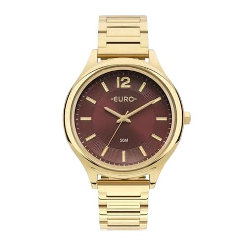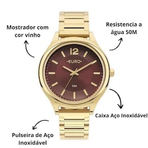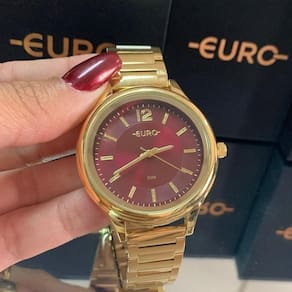 Relogio feminino euro dourado fundo vinho eu2033ba/4n A oficial mix é uma uma empresa especializada em vendas de produtos multimarcas, que desde 2015 encanta os seus cliente, oferecendo produtos de excelente qualidade, , com de fábrica e com preços imbatíveis. Gênero: feminino Cor: dourado/vinho Mecanismo: analógico Tamanho da caixa: médio Material da caixa: aço Material da pulseira: aço inoxidável Material do vidro: cristal mineral Comprimento do relógio: 18cm Espessura da caixa: 1,0cm Dimensões da caixa: 5,0cm de diâmetro Nível de resistência à água: 50m Pulseira ajustável: sim Calendário: não possui Cronômetro: não possui Função chime: não possui função de aviso de hora cheia do fabricante: do relógio de 1 ano. Produto .