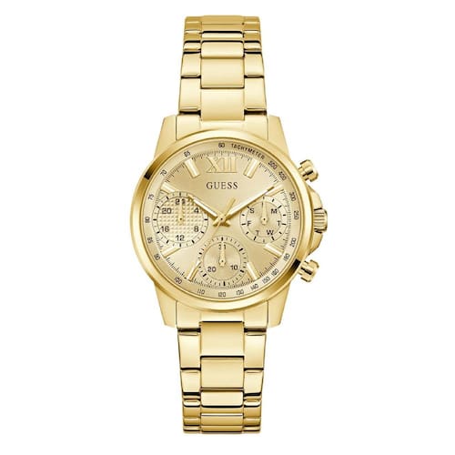 Relógio Feminino Guess Bailey GW0933L2 Dourado O relógio apresenta um mostrador dourado multifuncional com submostradores para dia da semana, data e hora em formato de 24 horas. O estojo de 36 mm é feito de aço inoxidável polido, complementado por uma pulseira de elos metálicos dourados e um fecho dobrável. Possui resistência à água de até 30 metros 3 ATM , adequada para uso diário e proteção contra respingos. Além disso, o modelo é descrito como parte da coleção Bailey da Guess, que combina elementos de estilo clássico com toques modernos, oferecendo peças versáteis e sofisticadas. Especificações Técnicas Mecanismo: Analógico Quartzo Gênero: Feminino Visor: Dourado Vidro: Cristal mineral Resistente à água: 30m Características: Submostradores para dia da semana, data e hora Diâmetro da caixa: 28mm Tipo de fecho: Fivela Simples : 1 ano pela fabricante Guess Marca: Não Informado Ean: 7909669215141