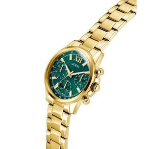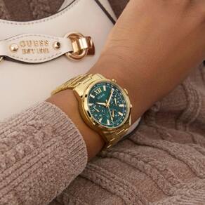 Relógio Feminino Guess Bailey GW0933L6 Dourado O relógio apresenta um mostrador dourado multifuncional com submostradores para dia da semana, data e hora em formato de 24 horas. O estojo de 36 mm é feito de aço inoxidável polido, complementado por uma pulseira de elos metálicos dourados e um fecho dobrável. Possui resistência à água de até 30 metros 3 ATM , adequada para uso diário e proteção contra respingos. Além disso, o modelo é descrito como parte da coleção Bailey da Guess, que combina elementos de estilo clássico com toques modernos, oferecendo peças versáteis e sofisticadas. Especificações Técnicas Mecanismo: Analógico Quartzo Gênero: Feminino Visor: Verde Vidro: Cristal mineral Resistente à água: 30m Características: Submostradores para dia da semana, data e hora Diâmetro da caixa: 28mm Tipo de fecho: Fivela Simples : 1 ano pela fabricante Guess Marca: Não Informado Ean: 7909669215172