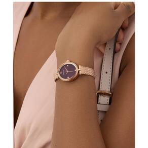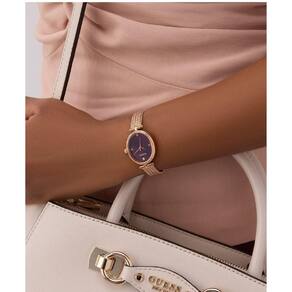 Relógio Feminino Guess Ruby GW0935L3 Rose Projetados para complementar qualquer look, estes modelos delicados oferecem um visual simples e sofisticado para seus relógios. Inspiradas na beleza natural das joias finas, estas peças são sutis, porém marcantes, perfeitas para usar em camadas ou sozinhas. Este modelo apresenta uma caixa oval de 29 mm x 24 mm em aço reciclado polido em tom rose, combinada com uma pulseira de malha texturizada em espinha de peixe com ajuste automático. O mostrador na cor roxa exibe uma pedra às 12 horas. Alimentado por um preciso movimento analógico de quartzo e resistente à água até 30 metros, este design atraente é perfeito para a mulher que aprecia detalhes autênticos de luxo e sofisticação atemporal. Especificações Técnicas Mecanismo: Analógico Quartzo Gênero: Feminino Visor: Roxo Vidro: Cristal mineral Resistente à água: 30m Características: Caixa oval, pulseira de malha, mostrador com pedra no 12h Diâmetro da caixa: 29mm Tipo de fecho: Fivela Simples : 1 ano pela fabricante Guess