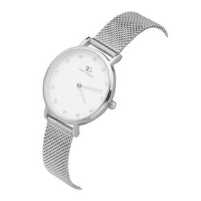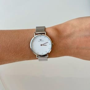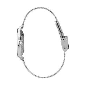 Relógio Feminino Harlem Diamond Silver 32mm Saint Germain com pulseira de aço inoxidável. A caixa é metal e o mostrador redondo apresenta pontos de cristais brilhantes dispostos de forma elegante. Seu vidro é com mineral endurecido de alta resistência.