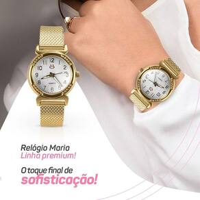 Relogio feminino inox dourado silicone banhado aço + caixa moda personalize presente casual social Eleve o seu estilo com o Relógio Feminino Orizom Maria Uma verdadeira fusão de luxo e personalidade, este relógio exclusivo é meticulosamente banhado a ouro, exalando sofisticação. Seu maquinário em aço inoxidável garante precisão e durabilidade, enquanto a pulseira em silicone ajustável oferece conforto inigualável, adaptando-se a todos os tamanhos de pulso com facilidade. E para completar, vem acompanhado de uma elegante caixa premium Orizom Maria, proporcionando segurança e estilo ao guardar o relógio.