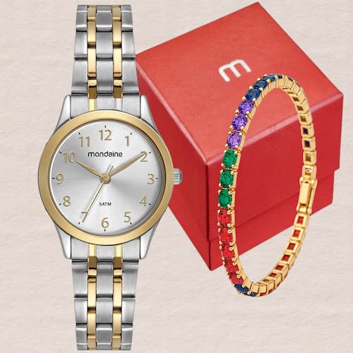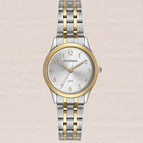 Relógio Feminino Mondaine Bicolor Aço Inox Casual Chic Mostrador Metálico Com Pulseira De Cristais 5ATM Modelo 32608LPMKBE3K2