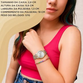 Este kit relógio bicolor combina sofisticação e delicadeza em um design que reflete estilo e romantismo. O mostrador metálico com numeração completa é envolvido por uma caixa de metal polido, enquanto a pulseira de aço confere durabilidade e conforto. Acompanha uma pulseira cravejado de cristais, compondo um conjunto perfeito para o dia a dia ou ocasiões especiais. Ideal para mulheres que valorizam acessórios versáteis e elegantes, mantendo o brilho e a sutileza em qualquer ambiente.