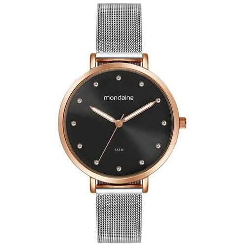 Relógio Feminino Mondaine Cristais Malha Prata com Rosé 32847LPMVGE2 Referência: 32847LPMVGE2 Este relógio analógico apresenta um mostrador preto com acabamento mate, complementado por marcações com cristais que adicionam brilho discreto. Os ponteiros com efeito luminoso garantem fácil leitura, mesmo em ambientes com pouca luz. A caixa em metal rosé de 3,6 cm de diâmetro destaca-se pelo design clean. Sua pulseira em malha de aço cromada, resistente e confortável, conta com um fecho de pressão que proporciona um ajuste perfeito ao pulso. Ideal para quem busca um acessório refinado com toques de brilho e funcionalidade. Especificações ATM - Pressão Máxima 5 ATM Altura 9 mm Comprimento Do Relógio 22 cm Número Elos Removíveis 0 Alarme Não Tamanho Da Caixa 36 mm Tamanho Do Vidro 33 mm Garantia 1 Ano Largura Da Pulseira 14 mm Saiba o tamanho ideal para você: Relógio Feminino Até 35 mm: Pulso P De 36 a 38 mm: Pulso M De 39 a 40 mm: Pulso G Acima de 40 mm: Pulso GG