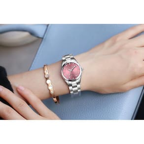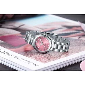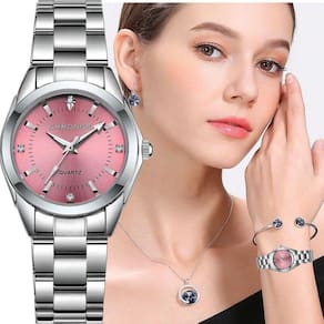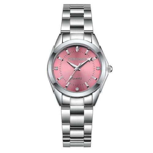 Você está comprando: 1 unidade do relógio de pulso chronos prata e fundo rosa Design de luxo, discreto e sofisticado. Estilo: social / casual Descrição do mostrador: Material de alta qualidade Exposição: analógico Formato: redondo Espessura: 9 mm Diâmetro: 28 mm Peso: 46 g
