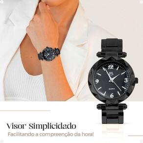 - Relógio Feminino Orizom Maria: Relógio analógico com maquinário, pulseira e mostrador na cor preto black piano, proporcionando um visual elegante e sofisticado. A tampa traseira é blindada e possui uma arte exclusiva da Orizom, reforçando sua autenticidade e atenção aos detalhes. Detalhes internos e externos podem variar de acordo com montagem do relógio no ato da compra.