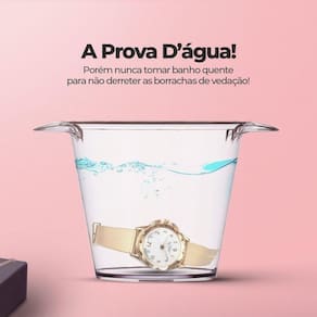 - Relógio Analógico à Prova D\'água: Cor Dourada e pulseira em silicone ajustável para garantir um ajuste confortável.
