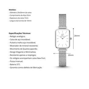 O Relógio Feminino New Port Quadrado Vermont Silver, equipado com pulseira de aço inoxidável prata, ostenta dimensões de 20x26mm. A caixa é elaborada em metal prateado, que se harmoniza com o mostrador branco protegido por um vidro de mineral resistente.