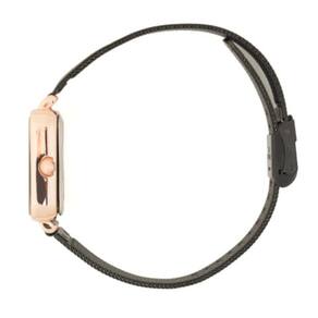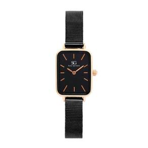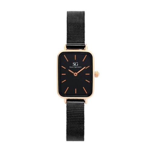 Relógio Feminino Saint Germain Quadrado Square Houston Rosé Gold com pulseira de aço inoxidável preta. A caixa é metal rosé gold e o mostrador preto, vidro com mineral endurecido com alta resistência.