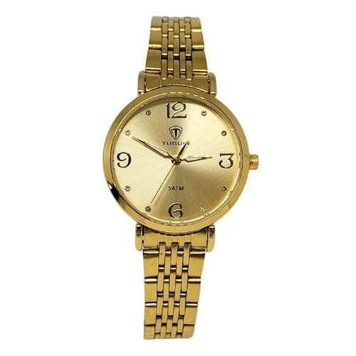 Relógio Feminino Relógio Tuguir ógico Tg205 Dourado Relógio Feminino Relógio Tuguir ógico Tg205 Dourado Marca: Tuguir Categoria: ógico ógico: Sim 1 Horário Ponteiros Fluorescentes: Sim Digital: Não Calendário: Não Despertador: Não Mostra o Dia da Semana: Não Mostra o Dia do Mês: Não Cronômetro: Não Contador Regressivo: Não Luz: Não Resistente à Água: 5 ATM Pode ser para nadar no raso, por pouco tempo submerso - Respingos: Sim - Chuva: Sim - Lavar Carro: Sim - Lavar Louça: Sim - Natação: Sim - Mergulho: Não Característica do Vidro: Cristal Mineral Tipo de Fecho: Dobrável com Botão Cor da Caixa: Dourado Material da Caixa: Metal Banho IP Formato da Caixa: Redondo Diâmetro da Caixa: 32,00 mm Espessura da Caixa: 8,50 mm Cor da Pulseira: Dourado Material da Pulseira: Aço Largura da Pulseira: 12,00 mm Comprimento Máximo da Pulseira: 130,00 mm Alimentação: Bateria Interna Peso Líquido: 0,053 Kg Modelo: Tg205 Cor Predominante: Dourado : 12 Meses Conteúdo da Embalagem: 01 Relógio 01 Embalagem 01 Termo de Marca: Não Informado