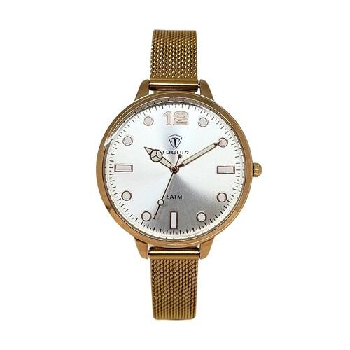 Marca: Tuguir Categoria: Analógico Analógico: Sim (1 Horário) Ponteiros Fluorescentes: Não Digital: Não Calendário: Não Despertador: Não Mostra o Dia da Semana: Não Mostra o Dia do Mês: Não Cronômetro: Não Contador Regressivo: Não Luz: Não Resistente à Água: 5 ATM - Respingos: Sim - Chuva: Sim - Lavar Carro: Sim - Lavar Louça: Sim - Natação: Sim - Mergulho: Não Característica do Vidro: Cristal Mineral Tipo de Fecho: Gancho Cor da Caixa: Rose Material da Caixa: Metal Banho IP Formato da Caixa: Redondo Diâmetro da Caixa: 37,00 (mm) Espessura da Caixa: 9,00 (mm) Cor da Pulseira: Rose Material da Pulseira: Aço Largura da Pulseira: 12,00 (mm) Comprimento Máximo da Pulseira: 240,00 (mm) Alimentação: Bateria Interna Peso Líquido: 0,050 Kg Modelo: TG227 Cor Predominante: Rose Cor Diferencial: Branco Garantia: 12 Meses