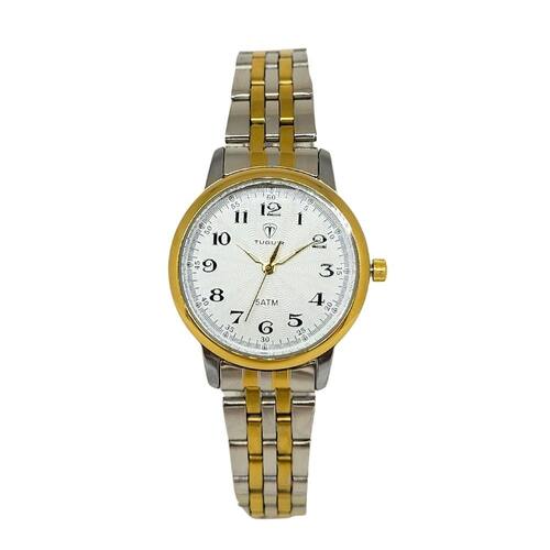 Marca: Tuguir Categoria: Analógico Analógico: Sim (1 Horário) Ponteiros Fluorescentes: Não Digital: Não Calendário: Não Despertador: Não Mostra o Dia da Semana: Não Mostra o Dia do Mês: Não Cronômetro: Não Contador Regressivo: Não Luz: Não Resistente à Água: 5 ATM - Respingos: Sim - Chuva: Sim - Lavar Carro: Sim - Lavar Louça: Sim - Natação: Sim - Mergulho: Não Característica do Vidro: Cristal Mineral Tipo de Fecho: Dobrável com Botão Cor da Caixa: Dourado Material da Caixa: Metal Banho IP Formato da Caixa: Redondo Diâmetro da Caixa: 30,00 (mm) Espessura da Caixa: 9,00 (mm) Cor da Pulseira: Prata Material da Pulseira: Aço Largura da Pulseira: 12,00 (mm) Comprimento Máximo da Pulseira: 125,00 (mm) Alimentação: Bateria Interna Peso Líquido: 0,052 Kg Modelo: TG228 Cor Predominante: Prata Cor Diferencial: Dourado Garantia: 12 Meses