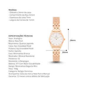 ESPECIFICAÇÕES TÉCNICAS Visor: Analógico Marca: New Port Movimento: Quartzo Japonês Caixa: Aço Inoxidável Rosê Pulseira: Aço Inoxidável Rosê Fecho: Gancho Face: Minimalista Branca Mostrador: Mineral Resistente Ponteiros: 02 Resistente: A Respingos Bateria: 377 Com Maior Durabilidade Design: Minimalista Elegante Mini Peso: 104g Categoria: Relógio Feminino Acompanha: Caixa da marca New Port e Manual Garantia: 12 meses contra defeito de fabricação