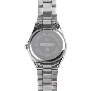 Marca: Skmei Categoria: Analógico Analógico: Sim 1 Horário Ponteiros Fluorescentes: Não Digital: Não Calendário: Não Despertador: Não Mostra o Dia da Semana: Não Mostra o Dia do Mês: Não Cronômetro: Não Contador Regressivo: Não Luz: Não Resistente à Água: 3 ATM Resiste a imersões breves - Respingos: Sim - Chuva: Sim - Lavar Carro: Sim - Lavar Louça: Sim - Natação: Não - Mergulho: Não Característica do Vidro: Acrílico Tipo de Fecho: Dobrável com Botão Cor da Caixa: Prata Material da Caixa: Metal Alloy Formato da Caixa: Redondo Diâmetro da Caixa: 28,70 mm Espessura da Caixa: 9,10 mm Cor da Pulseira: Prata Material da Pulseira: Metal Largura da Pulseira: 14,20 mm Comprimento Máximo da Pulseira: 210,00 mm Alimentação: Bateria Interna Peso Líquido: 0,064 Kg Modelo: 1620 Marca: Não Informado Ean: 7908289223017