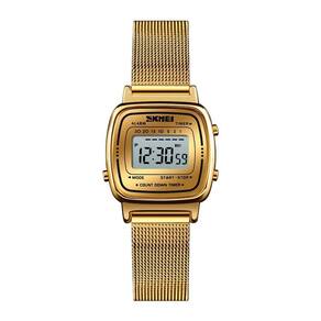 Relógio Feminino Skmei Digital 1910 Dourado Relógio Feminino Skmei Digital 1910 Dourado Marca: Skmei Categoria: Digital Analógico: Não Digital: Sim 1 Horário Calendário: Sim Despertador: Sim Mostra o Dia da Semana: Sim Mostra o Dia do Mês: Sim Cronômetro: Sim Contador Regressivo: Não Luz: Sim Cor da Iluminação: Verde Resistente à Água: 3 ATM Resiste a imersões breves - Respingos: Sim - Chuva: Sim - Lavar Carro: Sim - Lavar Louça: Sim - Natação: Não - Mergulho: Não Característica do Vidro: Cristal Mineral Tipo de Fecho: Gancho Cor da Caixa: Dourado Material da Caixa: Metal Banho IP Formato da Caixa: Quadrado Comprimento da Caixa: 24,20 mm Largura da Caixa: 25,70 mm Espessura da Caixa: 9,20 mm Cor da Pulseira: Dourado Material da Pulseira: Aço Largura da Pulseira: 12,30 mm Comprimento Máximo da Pulseira: 210,00 mm Alimentação: Bateria Interna Peso Líquido: 0,150 Kg Modelo: 1910 Cor Predominante: Dourado : 12 Meses Conteúdo da Embalagem: 01 Relógio 01 Embalagem 01 Termo de Marca: Não Informado