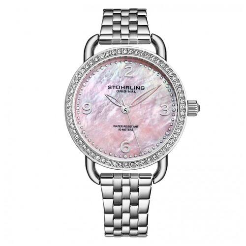 Caixa feminina de quartzo prateado, bisel prateado cravejado de cristal, mostrador rosa MOP, ponteiros e marcadores prateados, relógio com pulseira de elo prateado TT