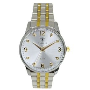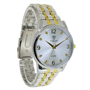 Relógio Feminino Tuguir Analógico 2130 Prata e DouradoMarca: Tuguir Categoria: Analógico Analógico: Sim (1 Horário) Ponteiros Fluorescentes: Selecione Digital: Não Luz: SelecioneResistente à Água: 5 ATM (Pode ser utilizado para nadar no raso, por pouco tempo submerso) - Respingos: Sim - Chuva: Sim - Lavar Carro: Sim - Lavar Louça: Sim - Natação: Sim - Mergulho: Não Característica do Vidro: Cristal Mineral Tipo de Fecho: Dobrável com Botão Cor da Caixa: Prata Material da Caixa: Metal Banho IP Formato da Caixa: Redondo Diâmetro da Caixa: 39,00 (mm) Espessura da Caixa: 11,00 (mm) Cor da Pulseira: Prata Material da Pulseira: Aço Largura da Pulseira: 17,50 (mm) Comprimento Máximo da Pulseira: 270,00 (mm) Alimentação: Bateria Interna Peso Líquido: 0,080 Kg Modelo: 2130 Cor Predominante: Prata Cor Diferencial: Dourado Garantia: 12 MesesConteúdo da Embalagem: 01 Relógio 01 Embalagem 01 Termo de Garantia
