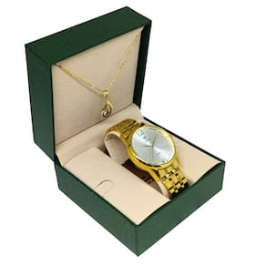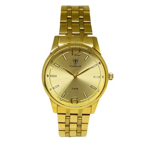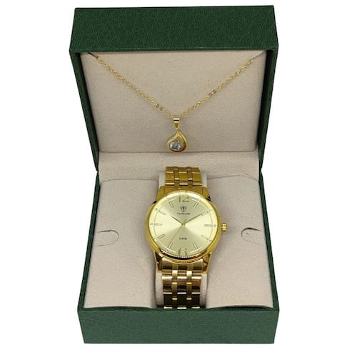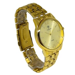 Marca: Tuguir Categoria: Analógico Analógico: Sim (1 Horário) Ponteiros Fluorescentes: Não Digital: Não Luz: Selecione Resistente à Água: 5 ATM - Respingos: Sim - Chuva: Sim - Lavar Carro: Sim - Lavar Louça: Sim - Natação: Sim - Mergulho: Não Característica do Vidro: Cristal Mineral Tipo de Fecho: Dobrável com Botão Cor da Caixa: Dourado Material da Caixa: Metal Banho IP Formato da Caixa: Redondo Diâmetro da Caixa: 39,00 (mm) Espessura da Caixa: 11,00 (mm) Cor da Pulseira: Dourado Material da Pulseira: Aço Largura da Pulseira: 17,50 (mm) Comprimento Máximo da Pulseira: 270,00 (mm) Alimentação: Bateria Interna Peso Líquido: 0,080 Kg Modelo: 9182E Cor Predominante: Dourado Garantia: 12 Meses