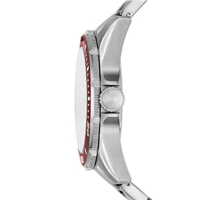 Gênero: Masculino Tipo de Energia: Quartz Resistência a Água: 50 metros Cor da Caixa: Prata Cor do mostrador: Preto e bisel vermelho Cor da Pulseira: Prata Material da pulseira: Aço inoxidável Tipo de Vidro: Cristal Mineral Largura da Caixa: 42mm de diâmetro Espessura da Caixa: 11mm Garantia: 02 anos.