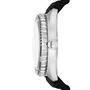 A caixa de aço inoxidável prata de 42 mm abriga um mostrador preto com textura ondulada que remete ao fundo do mar, realçado por marcadores circulares luminosos e ponteiros de alta visibilidade, incluindo um ponteiro de segundos em vermelho vibrante. O aro giratório unidirecional com escala de 60 minutos reforça o apelo esportivo e utilitário do relógio.