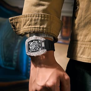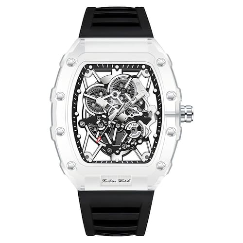 - ?Design?: o mostrador adota um design oco de dupla face, para que você possa ver claramente o funcionamento da estrutura interna do relógio. A caixa e a pulseira são feitas de materiais transparentes, tornando todo o relógio cristalino, moderno e de alta qualidade. O design em forma de tonneau lateral longo curvado duplo torna o relógio mais adequado para o pulso. Este é um relógio masculino moderno cheio de criatividade.