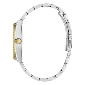 A combinação de cores e o acabamento refinado tornam este modelo versátil, ideal tanto para o uso diário quanto para ocasiões mais especiais. A pulseira em aço proporciona conforto e durabilidade, enquanto o aro com textura canelada reforça o visual sofisticado e contemporâneo do relógio.