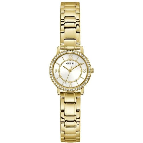 Mecanismo: Analógico (Quartzo) Gênero: Feminino Visor: Branco Vidro: Cristal mineral Prova d'água: 30m Características: caixa com cristais cravejados. Diâmetro da caixa: 28 mm Tipo de fecho: Gancho Garantia: 1 ano pela fabricante Guess