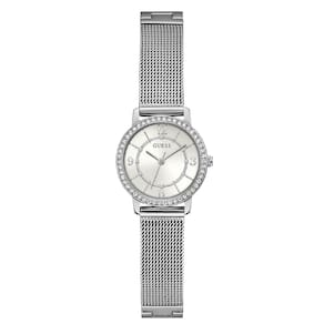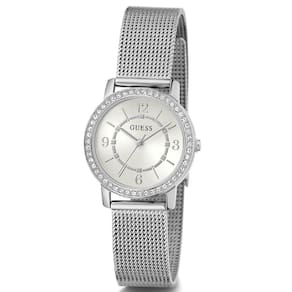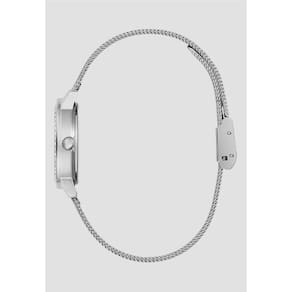 Relógio Guess Feminino Ladies Silver Tone GW0534L1 Prata Guess, a marca Californiana criadas para pessoas que gostam de luxo e elegância Os Relógios Guess possuem design próprio que realçam sua beleza e seu lifestyle. A linha Guess Ladies Dress tem o conceito de trazer o brilho e a delicadeza da mulher moderna. Especificações Técnicas Mecanismo: Analógico Quartzo Gênero: Feminino Visor: branco Vidro: Cristal mineral Prova d'água: 30m Características: pulseira em aço inoxidável prata, caixa com cristais cravejados. Diâmetro da caixa: 28mm Tipo de fecho: Fivela simples : 1 ano pela fabricante Guess
