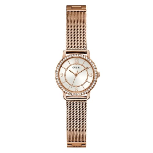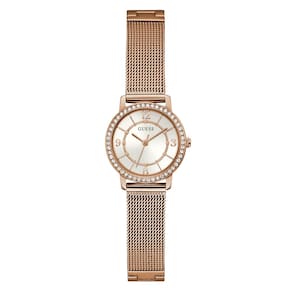 Relógio feminino GUESS de 28 mm - Pulseira em tom de ouro rosa com mostrador branco Caixa em tom de ouro rosa - Pulseira em tom de ouro rosa: este lindo relógio tem uma pulseira de ouro rosa de 7,5 polegadas que pode ser enfeitada para cima ou para baixo - Caixa em tom de ouro rosa: a caixa em tom de ouro rosa de 28 mm dá a este relógio uma aparência moderna e elegante - Movimento de quartzo: o movimento de quartzo garante cronometragem precisa com o mínimo de energia da bateria - Resistente à água: com um nível de resistência à água de 100 metros, este relógio pode resistir a respingos e breve imersão na água
