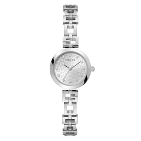 Relógio feminino GUESS de 26 mm — Mostrador prateado G-Link prateado — Mostrador prateado: apresenta um mostrador prateado com design tonal de bloco G repetido — Caixa de 26 mm: feita de aço inoxidável com caixa de 26 mm de diâmetro — Pulseira G-Link: inclui uma pulseira G-Link de 7,5 polegadas com elos G autoajustáveis — Resistente à água : resistente à água até 30 metros, tornando-o adequado para respingos e breve imersão
