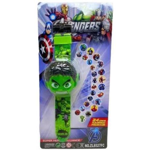 Descrição do produto: Relógio digital hulk projeta 24 imagens infantil Possui ajuste de foco, hora e data. Não é resistente a água. Habilidades desenvolvidas: auxilia no desenvolvimento da imaginação incentivando a descoberta e a exploração da criança. Pulseira ajustável elástica tamanho: 23cm x 6,5cm Conteúdo:hulk Faixa etária: a partir de 03 anos. Composição: plástico/ componentes eletrônicos. Cor: será enviando modelo e a cor disponível em . Este produto deve ser montado por um adulto antes de ser entregue à criança. Segurança inmetro Ce-bri/inac- 00265-01a nm 300/2002