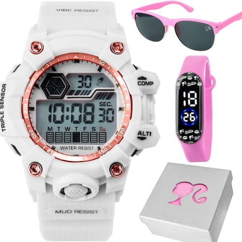 Relógio Infantil Digital + Óculos Proteção Sol UV + Caixa Criança Qualidade Premium Silicone Data Kit Infantil Orizom Kids - Relógios, Óculos de Sol e Caixa Premium Temática da Barbie Seu filho merece o melhor em estilo e diversão Apresentamos o Kit Infantil Orizom Kids, um conjunto exclusivo com relógios e óculos de sol temáticos da Barbie, perfeito para crianças e adolescentes que adoram acessórios estilosos. O que você vai receber: - Relógio Infantil Orizom Kids - Branco com Detalhes Rosa: resistente à água, com estrutura moderna, pulseira ajustável e design delicado. - Relógio Infantil Bracelete Orizom Kids - Temática da Barbie: formato inovador, cor rosa vibrante e ajuste confortável para qualquer pulso. - Óculos de Sol Infantil Orizom Kids - Modelo Rosa com Lente Preta: em acetato rosa, lentes preta ovaladas e proteção UV. - Caixa Premium Orizom Kids - Temática da Barbie: caixa exclusiva com acabamento brilhante e glitter rosa, ideal para presentear. Perfeito para diversas ocasiões, como dia a dia, festas e passeios, este kit é também uma excelente opção de presente para aniversários e outras datas comemorativas.