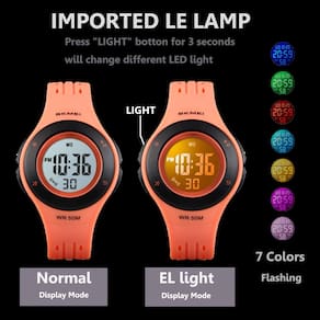 Descrição do produto: Relógio digital multifuncional para crianças ? Destaques: Luzes noturnas LED de 7 cores: azul escuro, verde, vermelho, azul celeste, laranja, rosa, roxo. Números grandes no mostrador e com luz de fundo EL, você pode ver a hora, seja dia ou noite. 50M resistente à água, adequado para uso diário, fique à vontade para lavar as mãos, tomar banho, chover, nadar e surfar. O design esportivo e elegante faz com que seu filho se destaque da multidão. Materiais confortáveis e de qualidade, proporcionam uma experiência de uso confortável. O movimento importado japonês fornece uma cronometragem precisa e precisa. Bateria de 3 anos, à prova de choque e durável, projetada para crianças brincando ao ar livre. ? Multifuncional: alarme de cronômetro, luzes LED coloridas de 5 ATM à prova d'água, 50 m/164 pés, calendário, tela semanal de 12/24 horas ? Especificação: diâmetro da caixa do mostrador: 1,49 pol/38 MM Espessura da caixa do mostrador: 0,51 pol/13 mm Largura da pulseira: 0,63 pol/16 mm Comprimento da pulseira: 9,63 pol/16 MM Cor do mostrador de 05 pol/230 MM: branco Cor da pulseira: preto, azul, laranja, rosa azul, rosa roxa Peso do relógio: 1,05 oz/30 g ? Material: movimento: japonês Estojo de movimento digital: estojo para PC Pulseira: pulseira de PU Superfície do espelho: vidro de resina transparente Parte traseira da caixa: aço inoxidável Fecho: aço inoxidável ? Nota: NÃO pressione nenhum botão debaixo d'água.