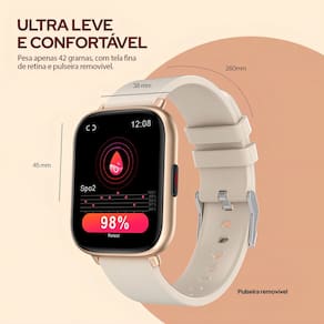 Tela de retina curva 2.5D de 45.5mm por 38mm e 8.9mm de altura, ideal para visualizar mensagens, monitorar saúde e acompanhar treinos em alta definição com cores vibrantes.