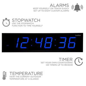 Este relógio de LED enorme da Ivation é exatamente o que você está procurando! Use-o no local de trabalho, na cozinha ou em qualquer cômodo. Grande e amplo, o relógio tem uma tela bonita e brilhante que mostra a hora claramente com o indicador AM e PM que brilha. Se você tem um pai idoso, especialmente um com baixa visão ou que tem um problema de memória, eles acharão este produto muito útil. O tempo é exibido claramente para eles com letras grandes, então não há necessidade de pedir ou ligar para ninguém para saber a hora. Compre isso para eles e eles agradecerão por este presente. Este relógio também é perfeito para ser utilizado em uma sala grande, escritório ou armazém, para que todos possam ver a hora de qualquer distância e anjo. Principais características do produto: Linda clara, fácil de ler na luz do dia como no escuro. Uma moldura preta completa um visual muito contemporâneo, a capa preta se adapta a qualquer decoração de casa ou escritório. O enorme relógio de LED DBTech pode ficar de pé sobre uma mesa ou ser pendurado na parede. O adaptador CA (incluído) se conecta a uma tomada embutida na parte de trás para que o relógio ainda fique pendurado. Luzes indicadoras melhoradas AM/PM. Em vez de uma pequena luz ao lado da manhã da tarde para indicar o status da hora, a manhã ou a própria PM brilham, para que você possa ver facilmente qual é o status da hora. Pré-programado e fácil de configurar. Este relógio tem um chip de memória especial e não precisará ser redefinido se perder energia. O enorme relógio de LED Ivation é coberto com uma garantia limitada de 1 ano. - Relógio digital elegante, JUMBO de 5 cm de altura | Cronometrista superdimensionado exibe hora, AM/PM e temperatura para maior comodidade | Dígitos de tamanho jumbo medem 8,3 cm de altura para máxima visibilidade e clareza | Alimentado por adaptador CA de 3 m [incluído] - Prático relógio de parada e temporizador | satisfaça todas as suas necessidades de tempo com um dispositivo | Defina um temporizador para uma receita, bata o seu melhor pessoal no seu próximo treino ou conte os minutos na sua próxima noite de jogo em família - Projetado para exibição de prateleira ou parede | Vem com furos embutidos e kit completo de ferragens para montagem sem desconforto | Ótima escolha para casa, grande sala, grandes espaços de escritório, empresas, crianças, idosos e deficientes visuais - 8 opções de alarme | O dispositivo possui 8 configurações exclusivas para alarmes e temporizadores | Mude e ajuste em um encaixe usando o controle remoto incluído - Controle remoto prático | Um relógio tão grande merece seu próprio controle! | Ajuste o brilho do LED (6 níveis de brilho) e defina o tempo, AM/PM [Chega de adivinhar o ponto] de longe | Leituras de temperatura com memória automática integrada e detecção rápida