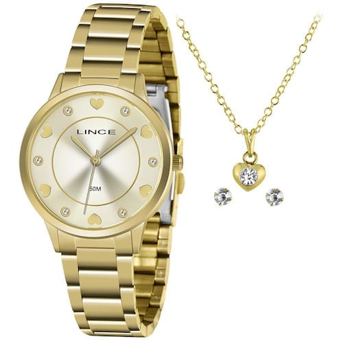 Relógio Feminino Lince Kit LRGH144LKY35S1KX Dourado Garanta estilo e sofisticação com o Relógio Feminino Lince Kit LRGH144LKY35S1KX Dourado. Esse relógio possui todo o design moderno e elegante que a Lince oferece, além de ser produzido com materiais de alta qualidade e resistência. O modelo LRGH144LKY35S1KX é perfeito para mulheres que buscam um acessório que complemente o seu estilo. Ele possui um mostrador na cor champagne e uma caixa dourada, que combinam perfeitamente, resultando em um visual charmoso e elegante. O relógio é movido a quartz, proporcionando um mecanismo analógico preciso e confiável. Além disso, ele possui um diâmetro de caixa de 39 mm e um visor de 34 mm, garantindo uma ótima visualização das horas. A resistência à água do relógio é de 5 ATM, o que significa que ele pode ser Utilizado durante atividades cotidianas como lavar as mãos, tomar chuva e nadar na piscina. No entanto, não é recomendado utilizá-lo durante mergulhos profundos. A pulseira do relógio é feita em aço inox, proporcionando durabilidade e conforto no uso diário. Ela possui uma largura de 18 mm e um comprimento de 20 cm, se ajustando perfeitamente ao pulso. Além do relógio, o kit também inclui um par de brincos e um colar folheado a ouro 18 K. Essas joias são produzidas com material antialérgico, garantindo conforto e segurança ao usá-las. Para manter a beleza e a durabilidade do seu relógio e das joias, recomendamos alguns cuidados simples, como evitar o contato com produtos químicos, como itens de limpeza e cloro de piscina. Além disso, é importante limpar a peça com uma flanela macia e guardar as joias individualmente. O Relógio Feminino Lince Kit LRGH144LKY35S1KX Dourado possui de 1 ano direto com o fabricante Orient Relógios da Amazônia LTDA, garantindo a qualidade e a confiabilidade do produto. Aproveite para adquirir esse maravilhoso relógio feminino Lince e complemente o seu visual com muito estilo e elegância. Peça já o seu!